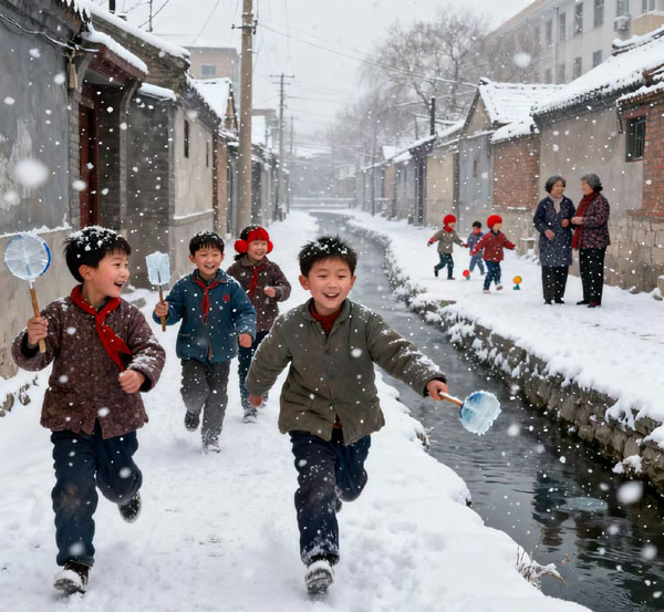 我小时候冬天的营口更有意思。雪一落,胡同里满是孩子的欢叫,“走啊,打冰嘎去!”“咱去河沿儿打出溜滑!”冰嘎就是陀螺,转起来的嗡嗡声,混着孩子们的笑声,能把寒冬都烘得暖起来。要是俩小子起了争执,一个瞪着眼说“你瞅啥”,另一个梗着脖子回“瞅你咋地”,听着像要吵架,可转眼又跑一块了玩儿去了——那点小挑衅里,全是营口孩子的直爽,没那么多拐弯抹角的心思。