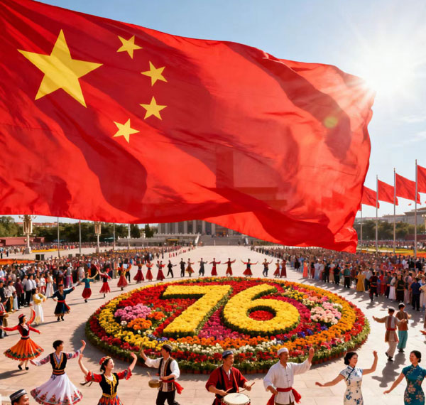 今朝庆典,四海同欢,喜气盈霄;此日欢歌,九州共乐,豪情涌潮。