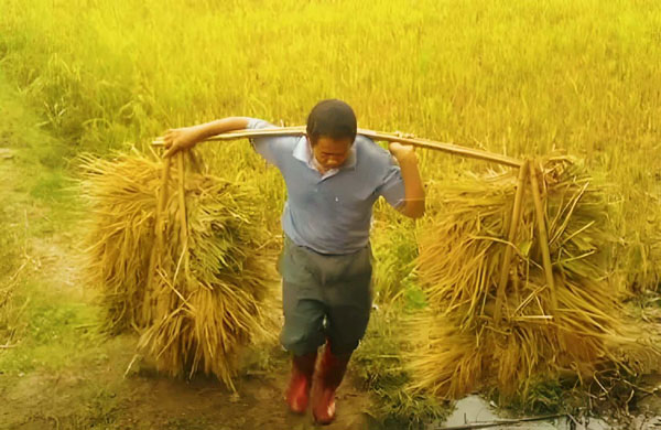 注:平水韵押阳韵。一肩新月指被两筐新稻压得肩上扁担挑就像一弯半月一般。