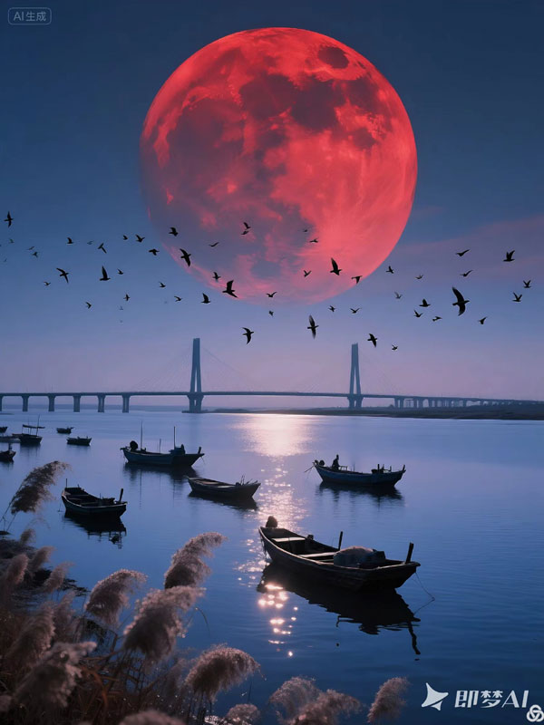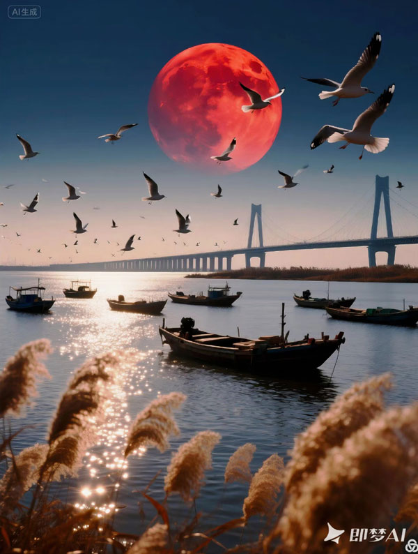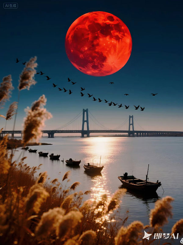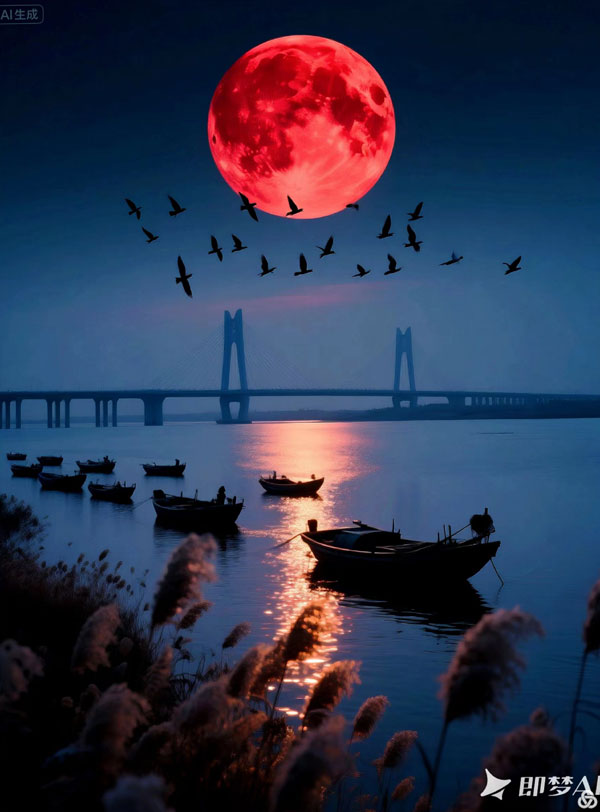 岸边的芦苇在晚风里轻晃,影子被月色拉得修长,与水中的月影交织成朦胧的画。陈征用AI捕捉下这一瞬——血月的神秘、辽河的静谧,还有湾畔土地的厚重,都凝在画面里。没有喧嚣,只有月色与河水的私语,仿佛连时间都在这抹红与蓝的交融中,悄悄慢了下来。