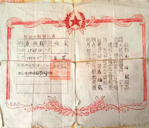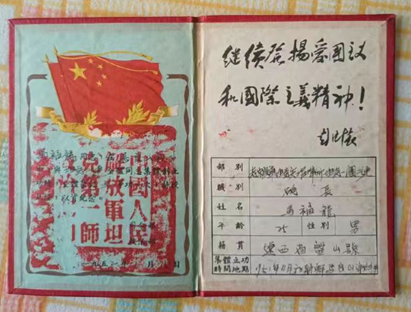 (颁发证书时间是1951年2月24日,5天后开赴朝鲜战场。)