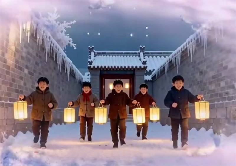 我们打着灯笼出门,兜里还揣着父亲给的几挂小鞭。雪地里脚印一串连一串,我们呼朋引伴,很快叫起院里小伙伴。大家举着灯笼在巷子里追逐,不时停下掏出小鞭,用香头点燃甩出去,“啪”的一声脆响,惊得雪沫簌簌掉落。灯笼光晕在雪色中交织,映亮青砖墙上的霜花和墙头的冰凌。笑声与鞭炮声混在一起,惊飞檐角缩脖的麻雀,引得路人频频回头,处处是辞旧迎新的欢喜。回到家,鞋帮子早已冻凉,母亲却已端上了热气腾腾的年夜饭,虽算不上丰盛,却是满桌的香。