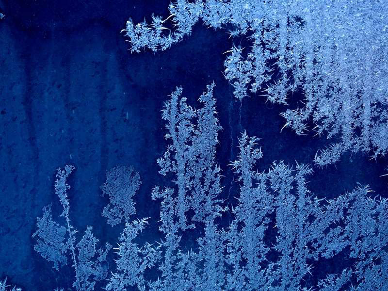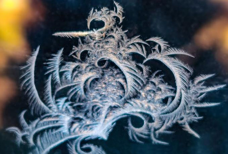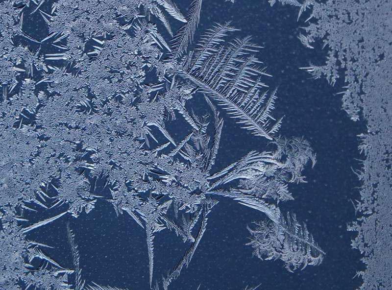 后记:冬夜室外气温很低,而室内气温高,空气中会有大量水蒸气,当水蒸气遇到温度在0℃以下的玻璃时,放出热量,在玻璃的内表面直接凝华成冰晶。由于玻璃表面的情况不同,有的光滑,有的毛糙,有的积有污垢,有的一尘不染,当冰晶向四周延伸时就形成了各式各样的花纹,这就是我们看到的“冰花”。