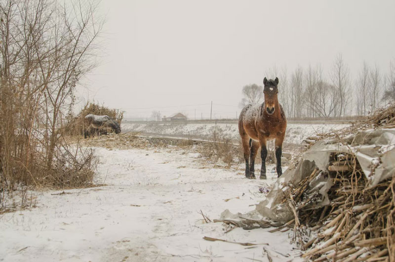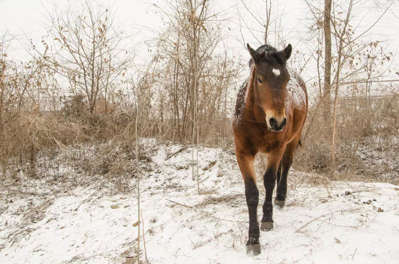 路上,透过白茫茫的雪雾,远远望见河对岸庄户人家外放的两匹枣红马,正低头吃着秫秸。它的背上,披上了洁白的雪衣,煞是漂亮。