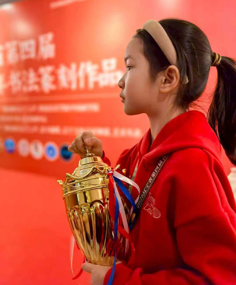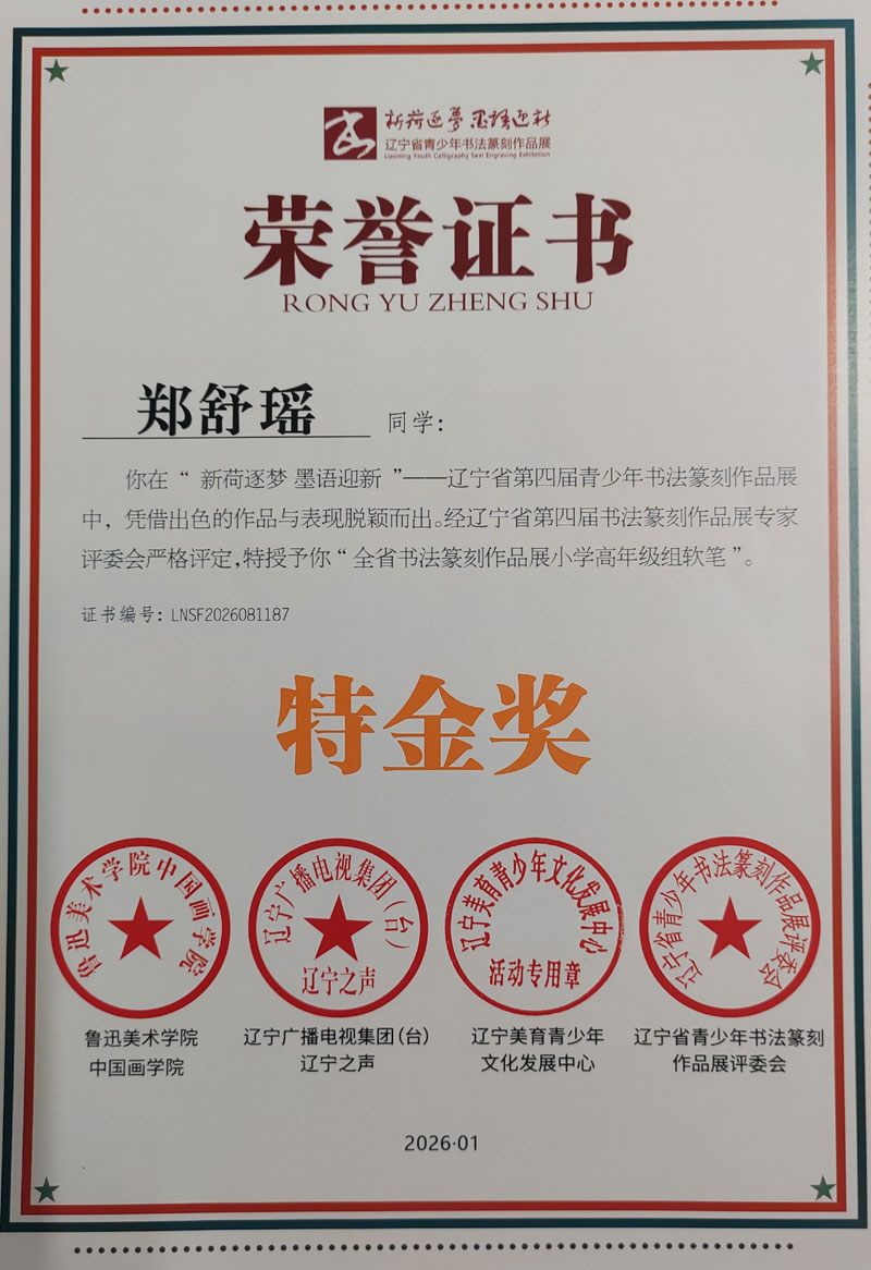 在辽宁省第四届青少年书法篆刻展览中,金石书法培训中心学员郑舒瑶于一万多件作品脱颖而出,荣获“特金奖”。