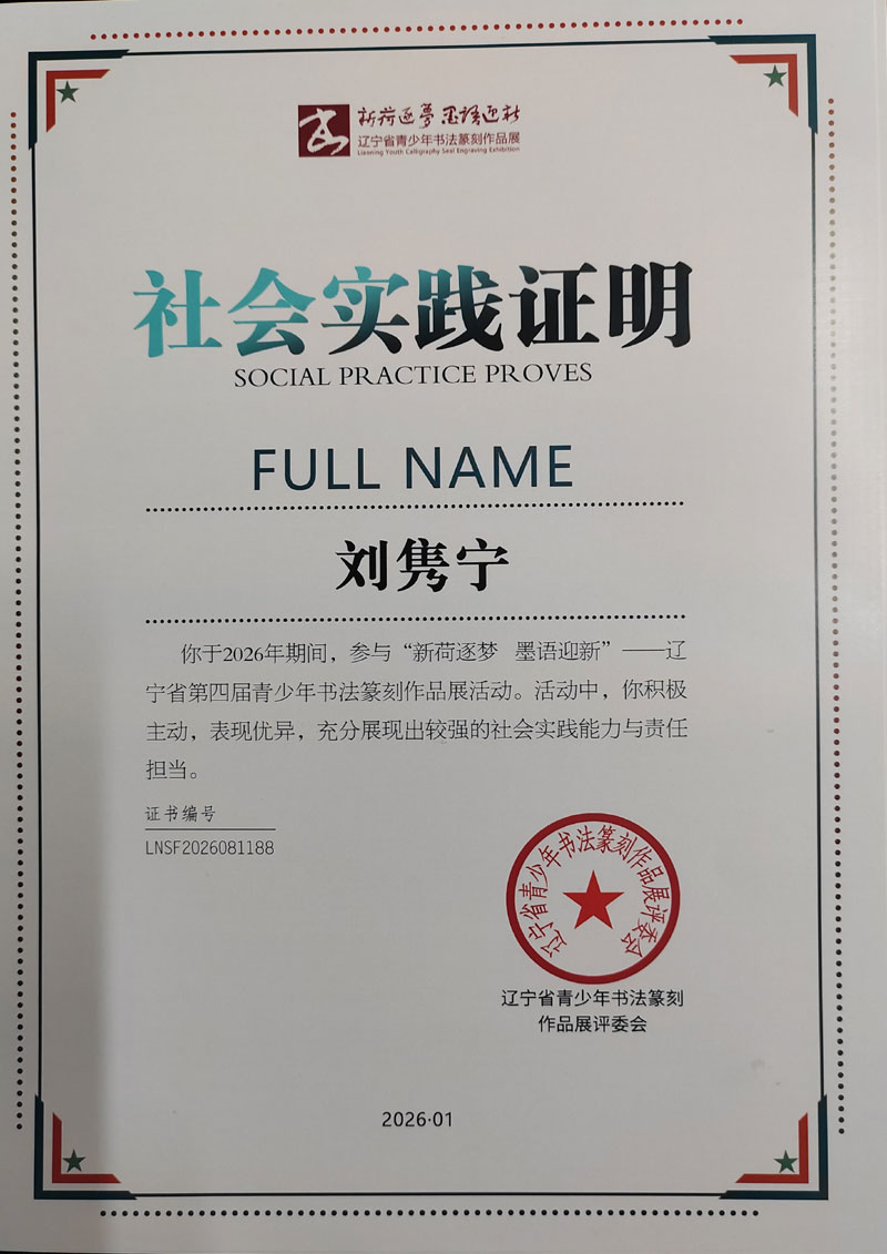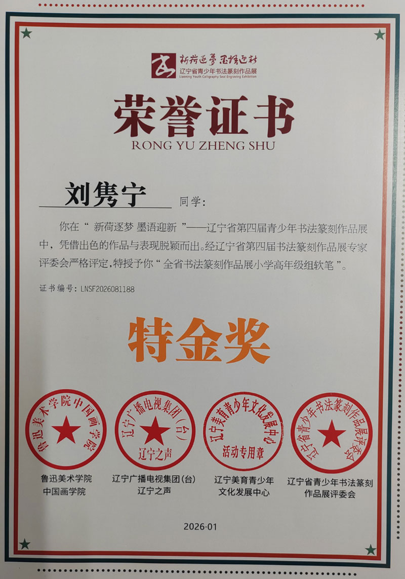 笔墨承薪火,少年书华章。“新荷逐梦,墨语迎新”,在辽宁省第四届青少年书法篆刻展中,大石桥市金石书法培训中心学员刘隽宁荣获“特金奖”。