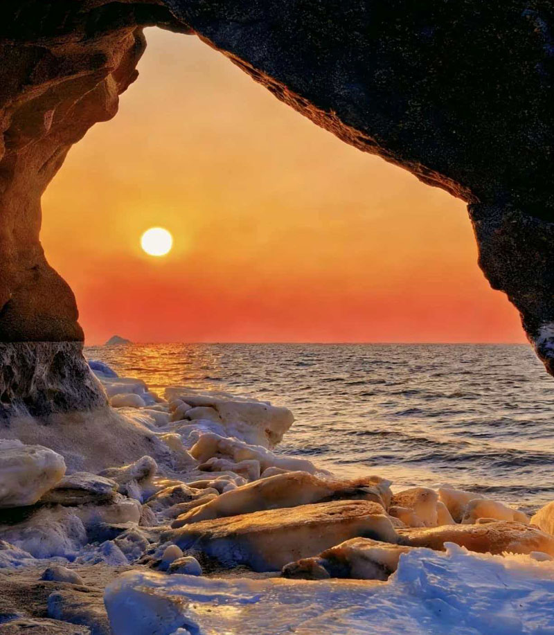 冻海忽开天一线,夕光穿洞万春秋。
