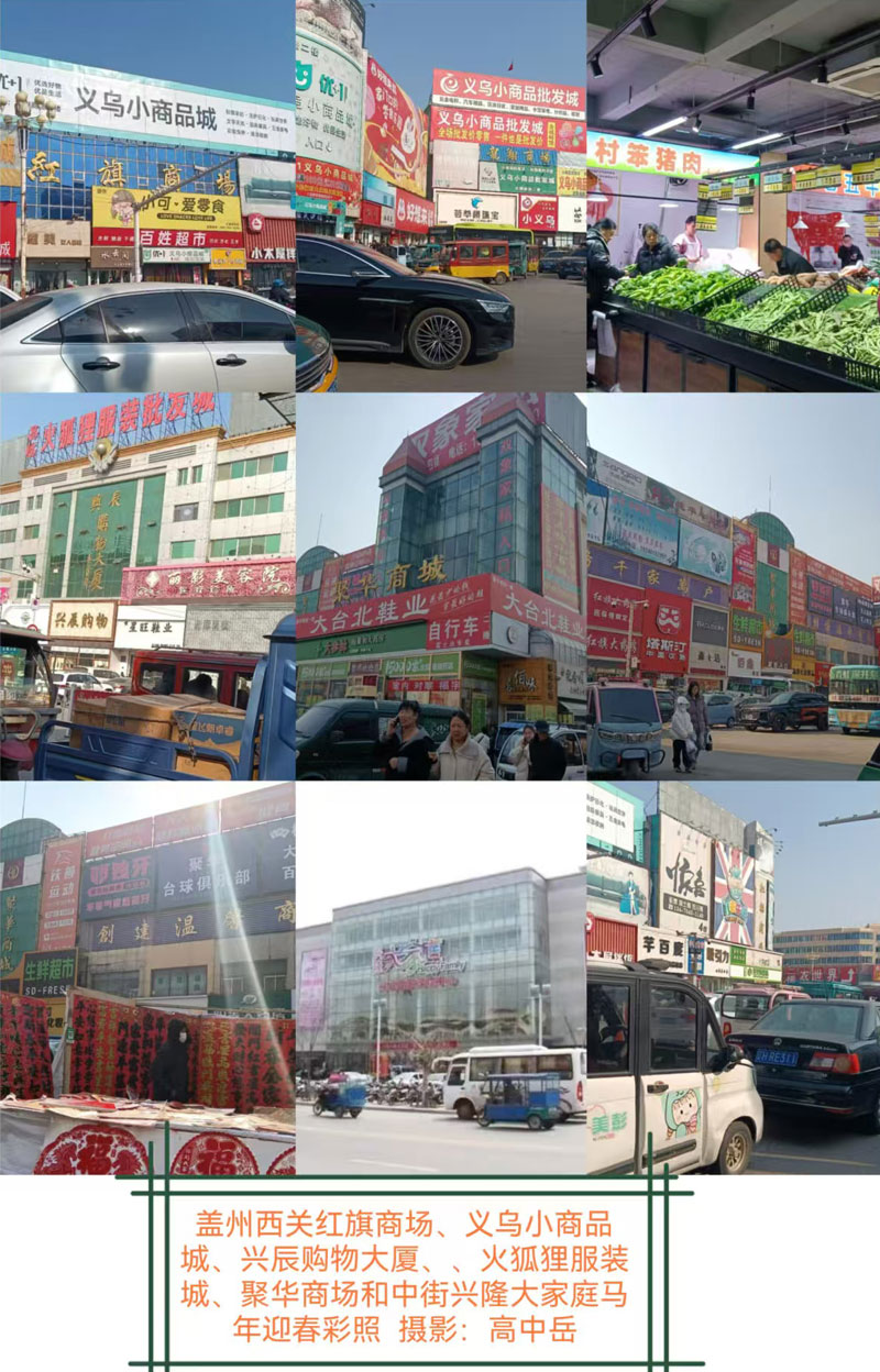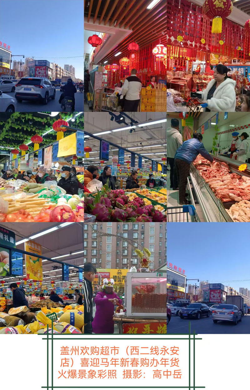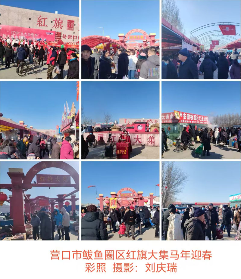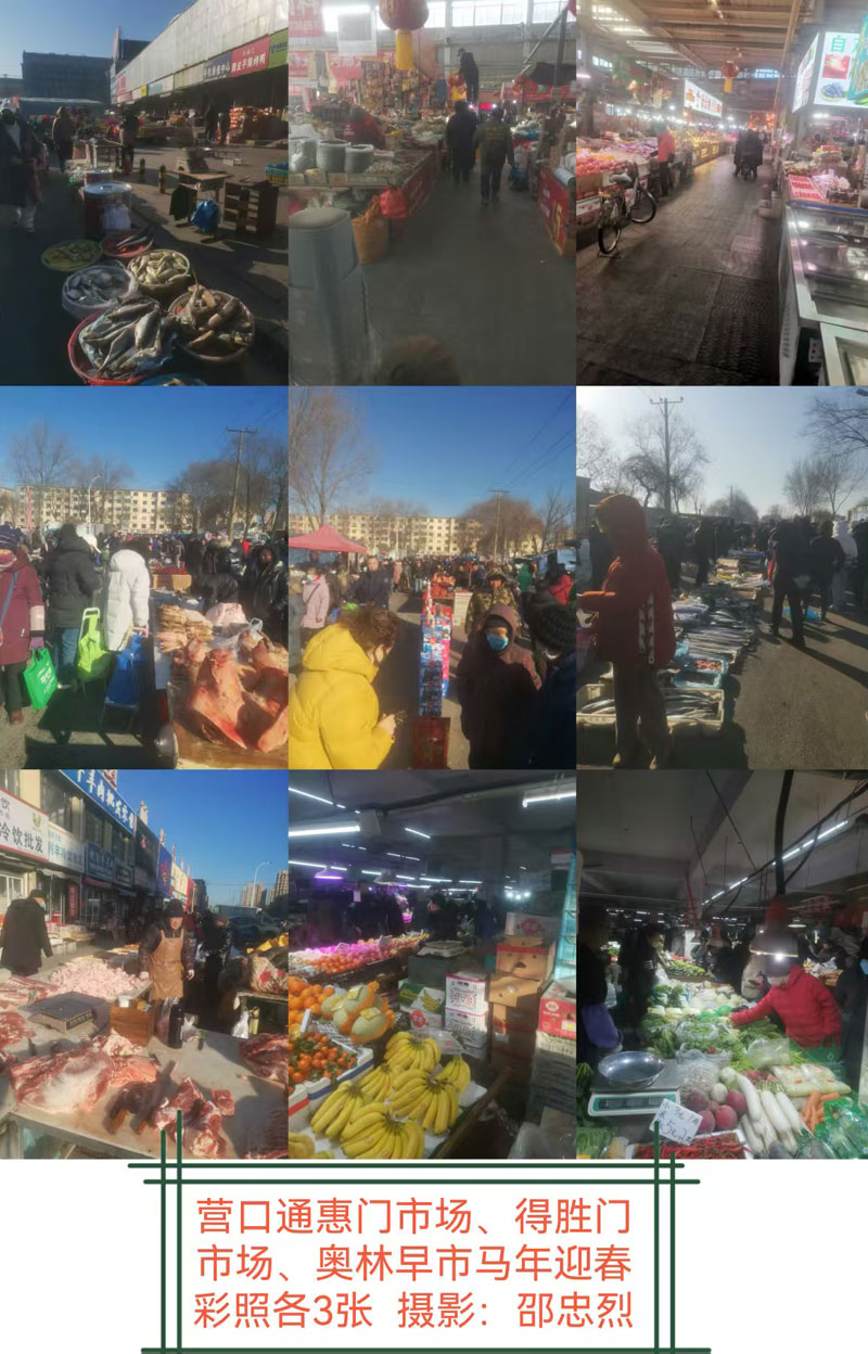 暮冬辽南,塞北营川,时届丙午马年将临之际,立春小年前后,余委托学友刘庆瑞、邵忠烈分别将营口市鲅鱼圈区红旗大集,以及营口市内通惠门市场、得胜门市场、奥林早市百姓喜迎马年新春购物的火爆场面拍下数十张彩照。同时,笔者本人也将盖州市内红旗商场、欢购超市等各处百姓欣购年货景象拍攝数张照片。並请诗友高德勋精心制作,拼图4个版面。在此谨向三友表示衷心感谢!