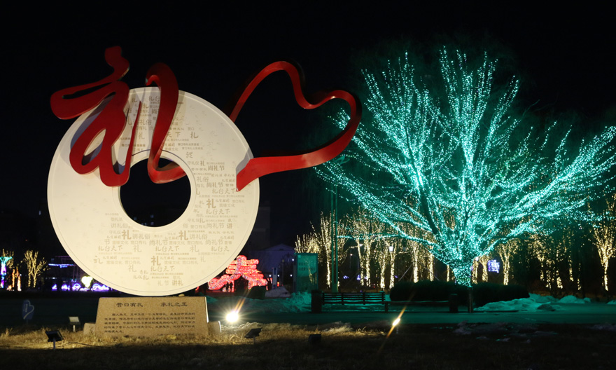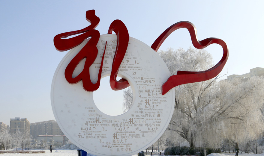 中国红的礼字飘扬形成意向的心形,简洁有力的传递了营口人心中遵德守礼,见贤思齐,礼行天下的城市道德生态理念。