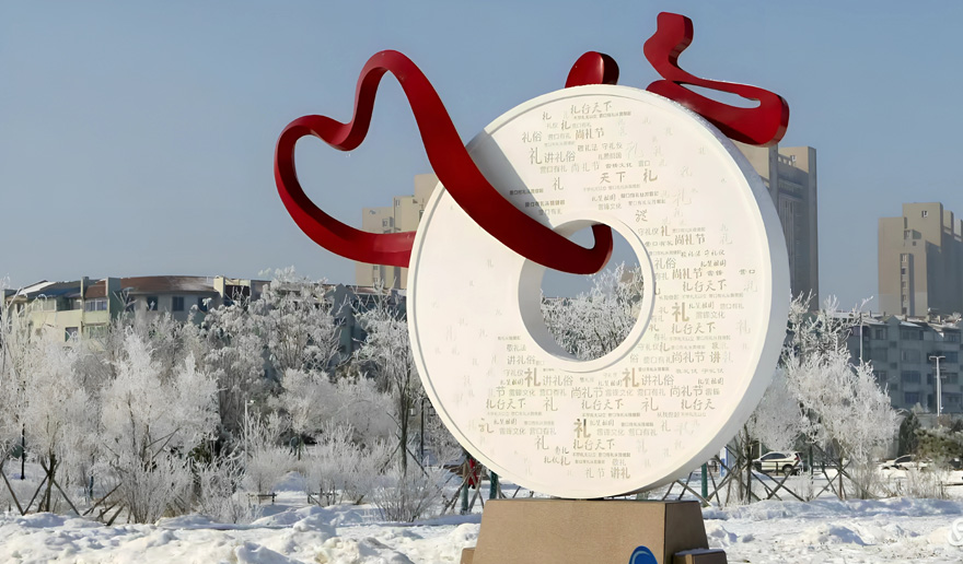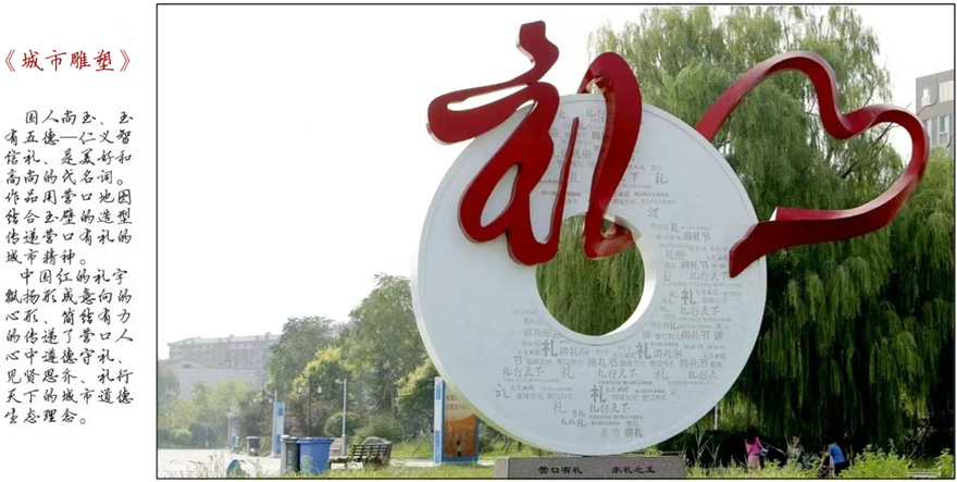 在营口红旗广场有一座城市雕塑,屹立在广场西侧。硕大的白色玉佩中间,穿越着一个红色礼字,在阳光照跃下光彩夺目。