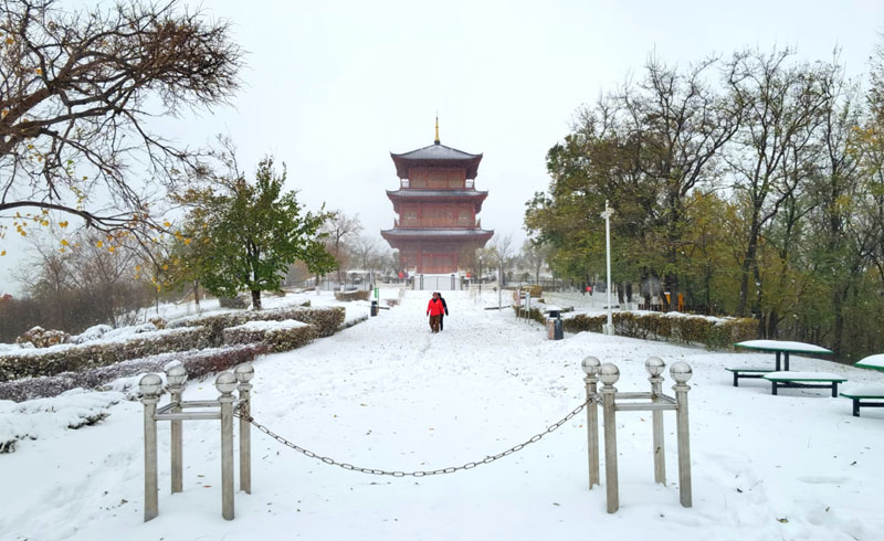 漫天雪花飘舞,簌簌落到青龙山公园。放眼望去,山前广场铺就白毯,牌坊的飞檐堆起厚雪,上山的石阶嵌着一溜银白。松槐凝霜似梨花盛开,柳丝垂着细碎冰晶随风轻晃。观景塔尖不时有雪团滚落,悬索大桥横卧成一道素练。人们踏着积雪或向山而上,或倾情欣赏北国风光。风掠过,抖落满树碎琼,天地清寂,满目洁白。