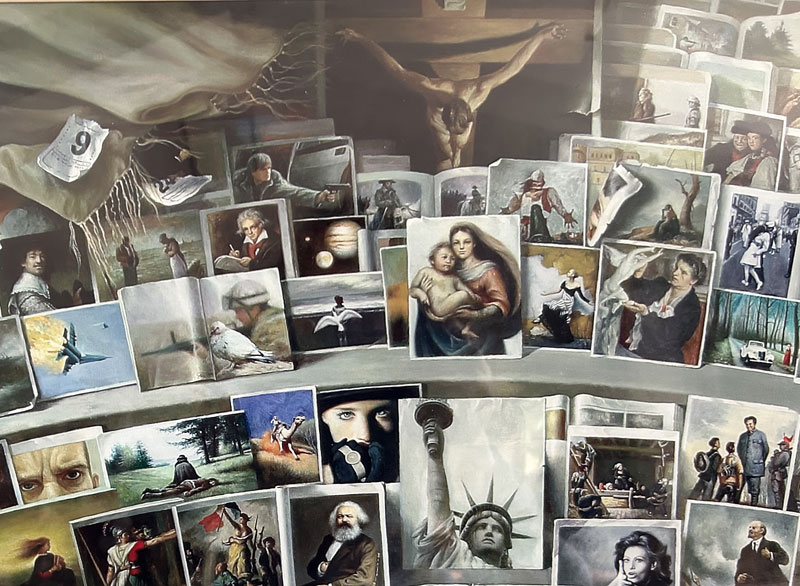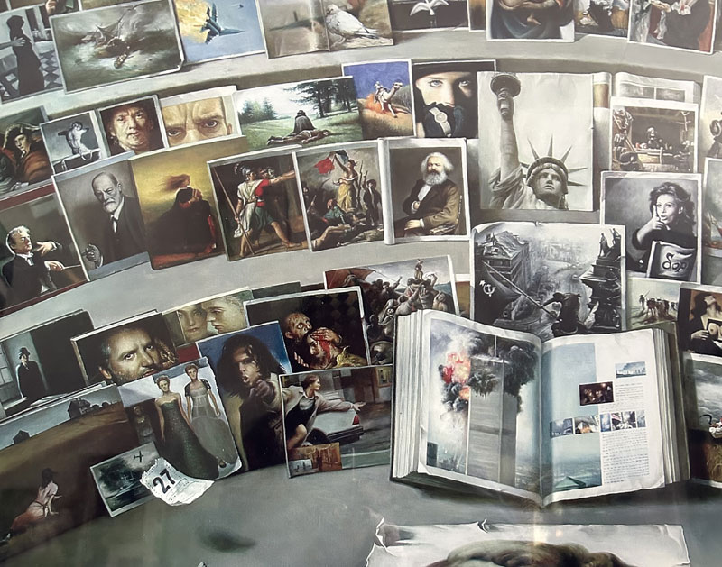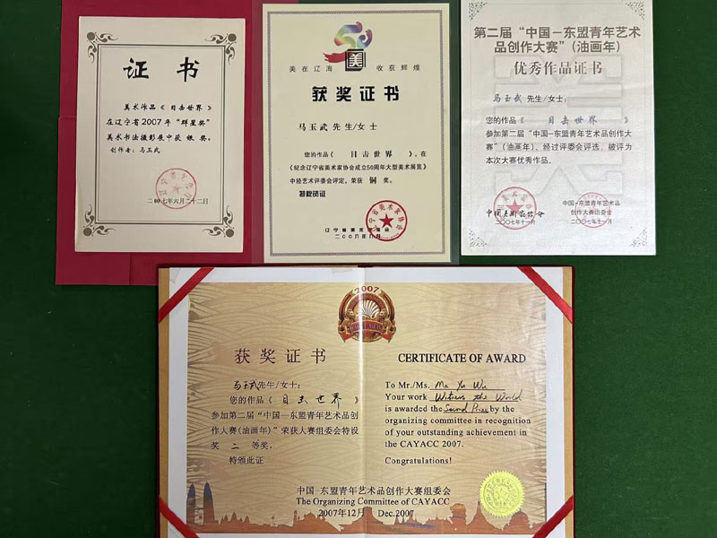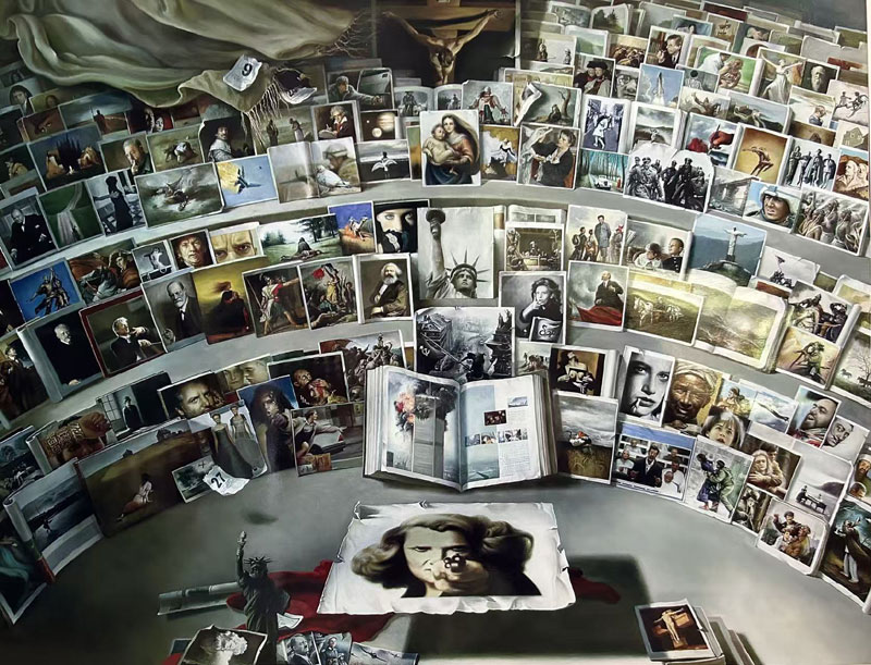 马玉武油画作品一一《目击世界》作于2004至2005年,作品通过不同的历史瞬间,以人类命运为主题,用精准的造型定格了上百个历史瞬间,表达了近现代以来爱痛交织的人类心路历程。该作品曾荣获《纪念辽宁省美术家协会成立50周年》大型美展,荣获铜奖,辽宁省《群星奖》获银奖,荣获由中国美术家协会举办的《第二届中国一一东盟艺术品创作大赛》获组委会二等奖,被南宁博物馆永久收藏。