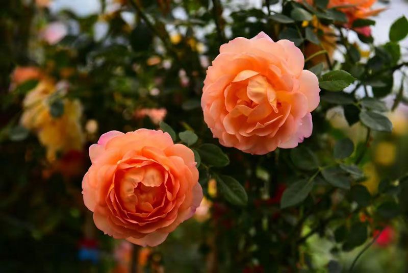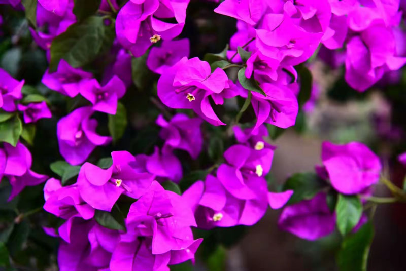 紫色的藤蔓花如瀑布倾泻而下,层层叠叠的花瓣在柔和光线下泛着光泽,交相辉映,营造出丰富的视觉层次。身旁的绣球花团锦簇,淡粉、橙黄、柔粉的花朵次第展开,有的含苞待放,有的已露蕊心,绿叶衬托下更显娇艳。它们攀援成墙,构成一道浪漫花廊,微风拂过,暗香浮动,令人驻足流连。勾勒出一幅有序而自然的园艺画卷。