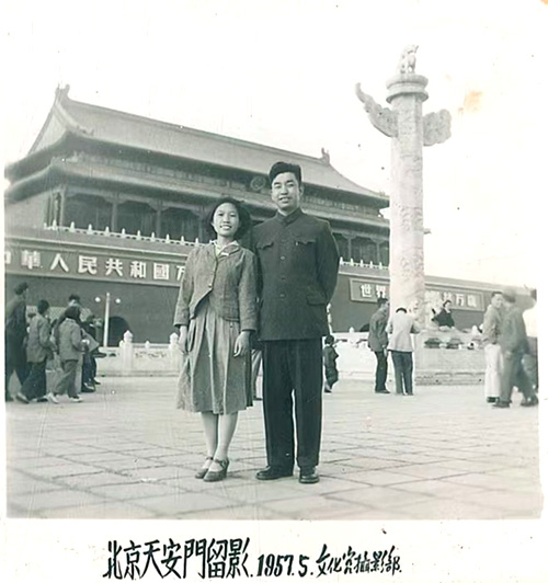 1957年5月,黄云腾到北京参加全军英模大会,受到毛主席的接见,曹子琼在人民大学法律系学习,两人在天安门前合影。