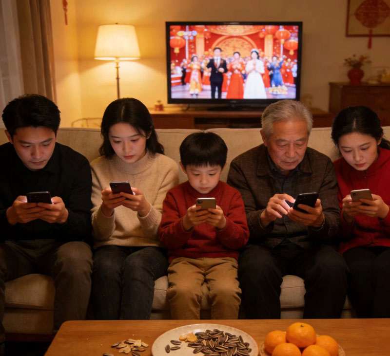 现代人过春节,比前几年新事可多多了。电视里各个台的春节晚会的热闹声像往常一样流淌着。不过比起屏幕里的歌舞,我们一家人更专注地盯着手里的方寸荧屏——手指悬在屏幕上方,像随时准备捕食的猎手。