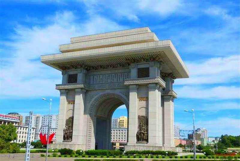 我们经过万寿台议事堂,驱车来到牡丹峰下。山上苍松蓊郁,山下碧流如带。朝鲜人民的伟大领袖金日成的高大紫红色铜像,在朝阳的辉映下,显得光芒四射。然后,参观了千里马铜像。游览了凯旋门。凯旋门是1982年建成的。在建筑艺术上,在历史沉淀中,它虽然不能与19世纪初建成的,世界驰名的巴黎凯旋门相提并论,但它竟比巴黎凯旋门高出十多米,有三层歇山式屋顶,全部用大理石砌成,规模宏大,令人惊叹。