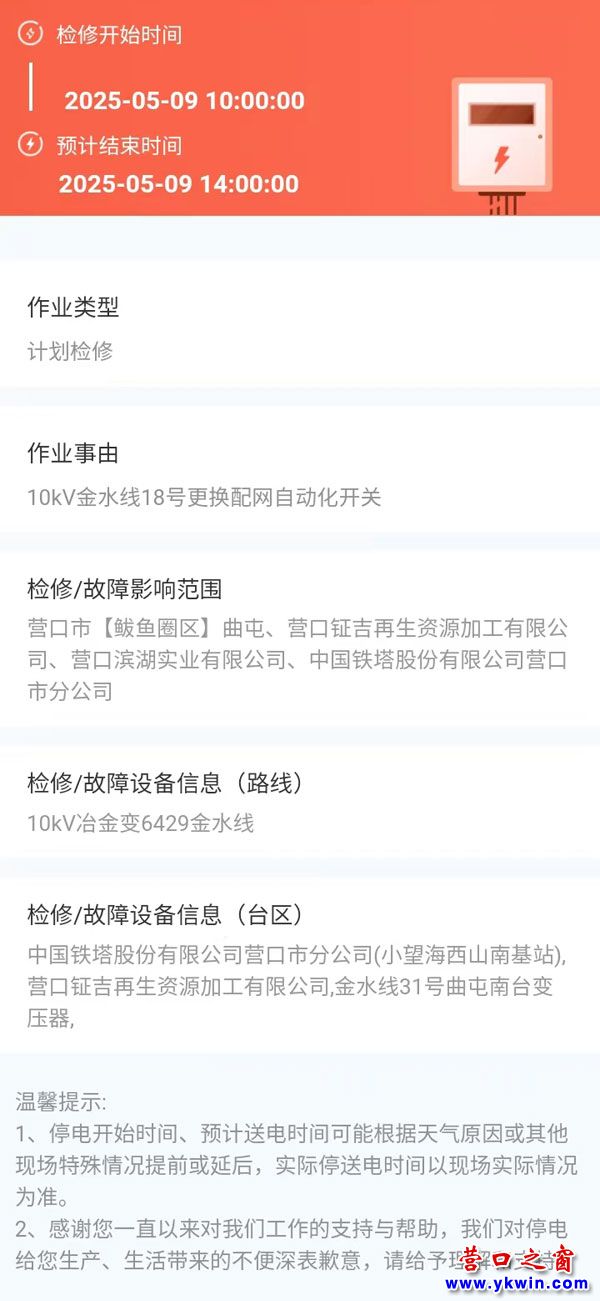 上一篇:2025年05月08日 鲅鱼圈区电网检修公告 下一篇:2025年05月14日 鲅鱼圈区电网检修公告