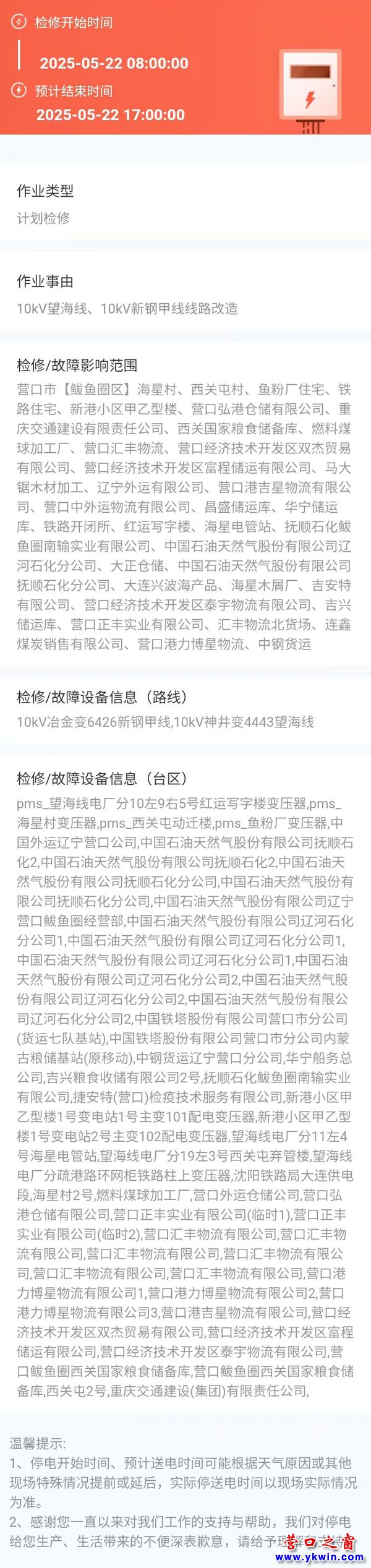 上一篇:2025年05月20日 鲅鱼圈区电网检修公告 下一篇:2025年05月23日 鲅鱼圈区电网检修公告