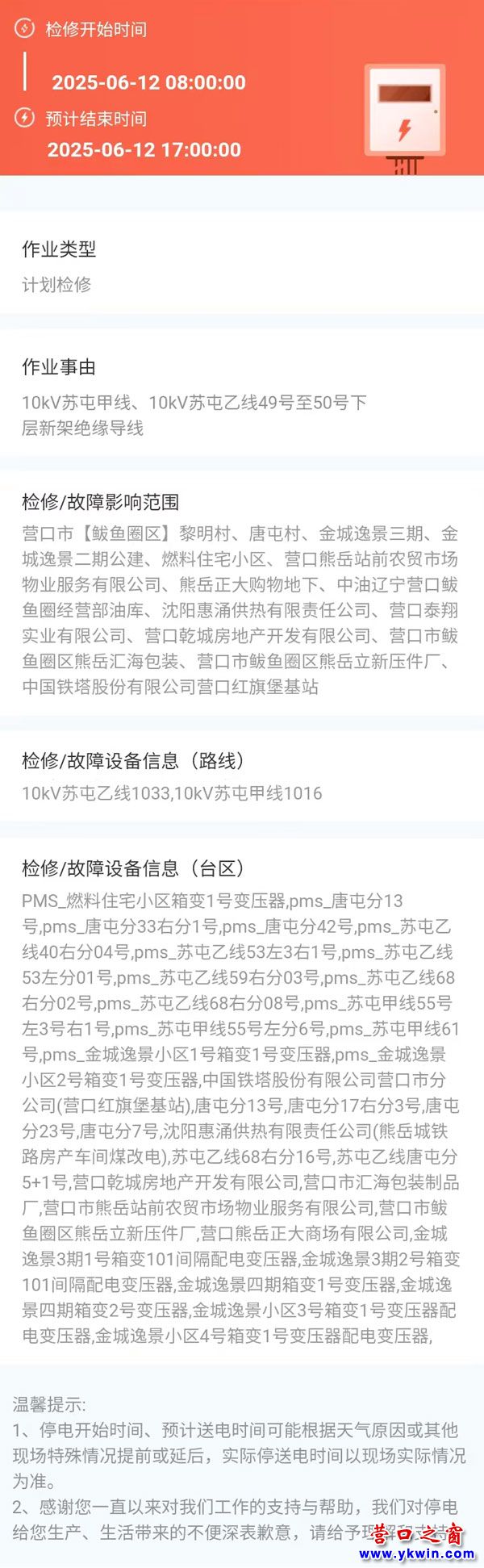 上一篇:2025年06月04日 鲅鱼圈区电网检修公告 下一篇:2025年06月11日 鲅鱼圈区电网检修公告
