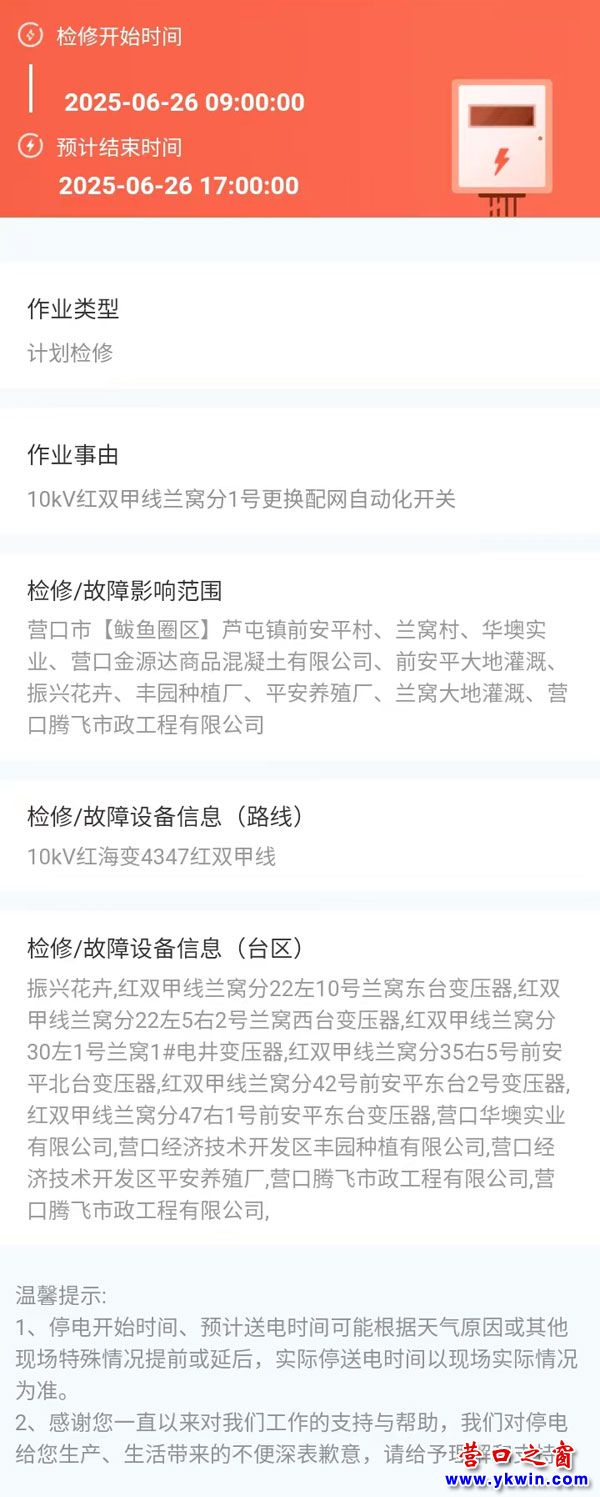 上一篇:2025年06月24日 鲅鱼圈区电网检修公告 下一篇:2025年07月10日 鲅鱼圈区电网检修公告