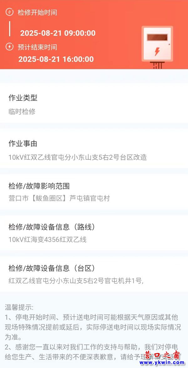 上一篇:2025年08月26日 鲅鱼圈区电网检修公告 下一篇:2025年08月27日 鲅鱼圈区电网检修公告