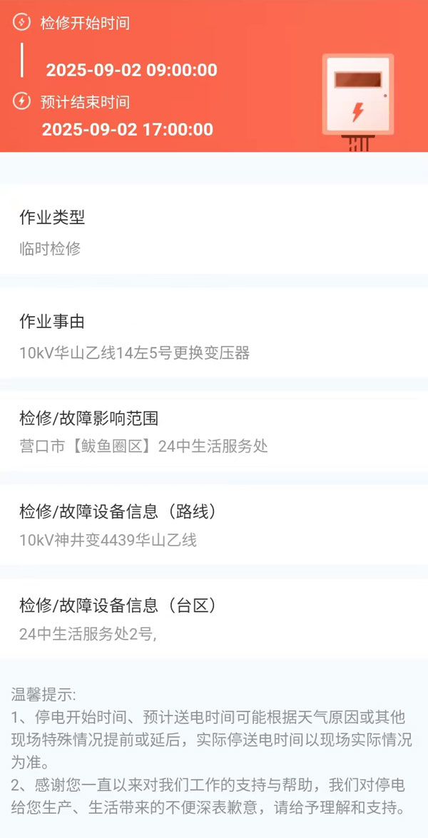 上一篇:2025年09月05日 鲅鱼圈区电网检修公告 下一篇:2025年09月10日 鲅鱼圈区电网检修公告