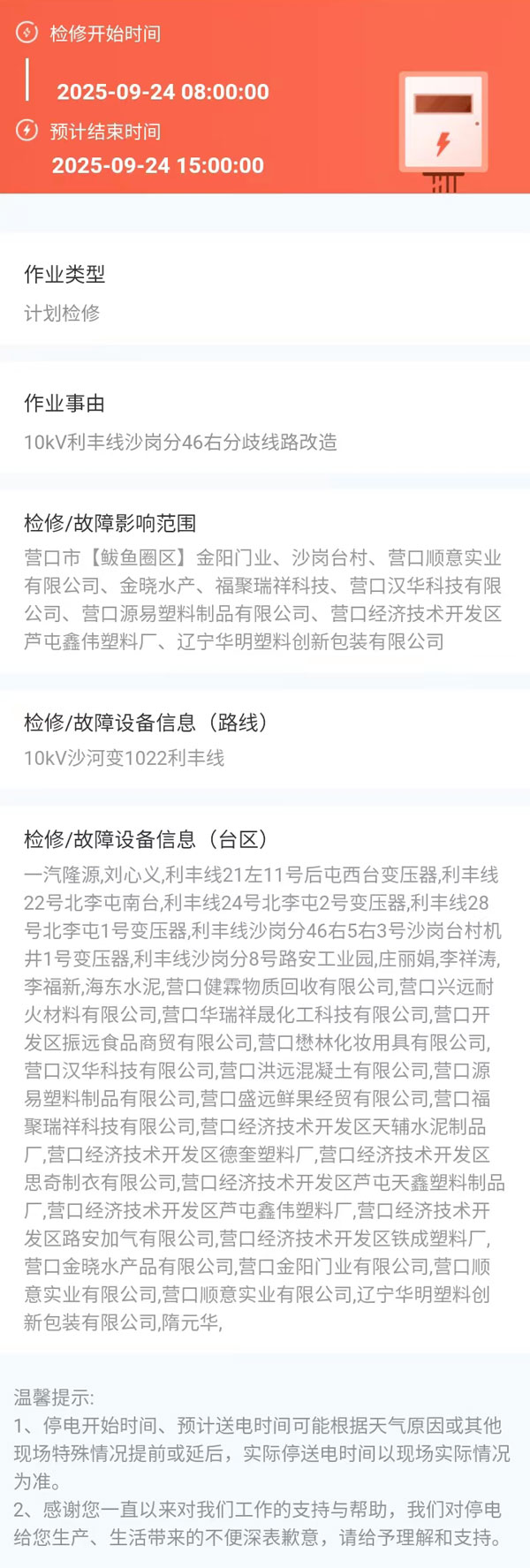 上一篇:2025年09月09日 鲅鱼圈区电网检修公告 下一篇:2025年09月25日 鲅鱼圈区电网检修公告