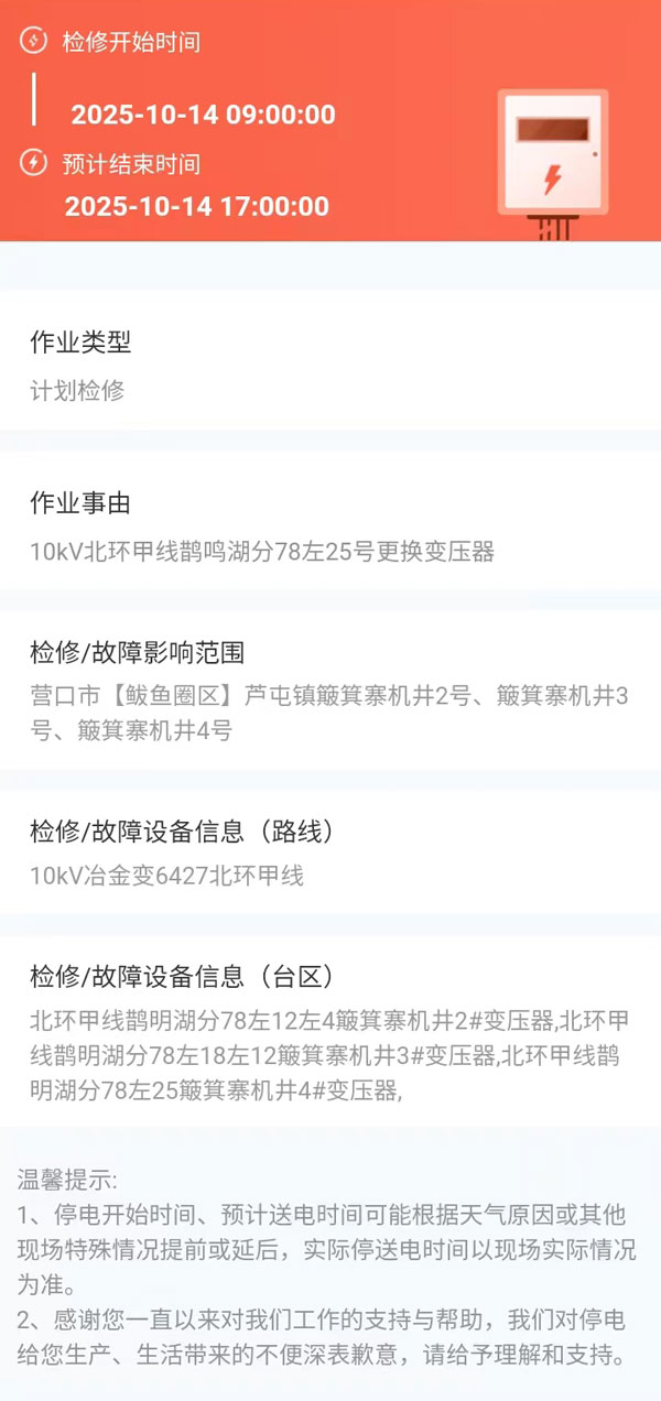 上一篇:2025年10月10日 鲅鱼圈区电网检修公告 下一篇:2025年10月15日 鲅鱼圈区电网检修公告