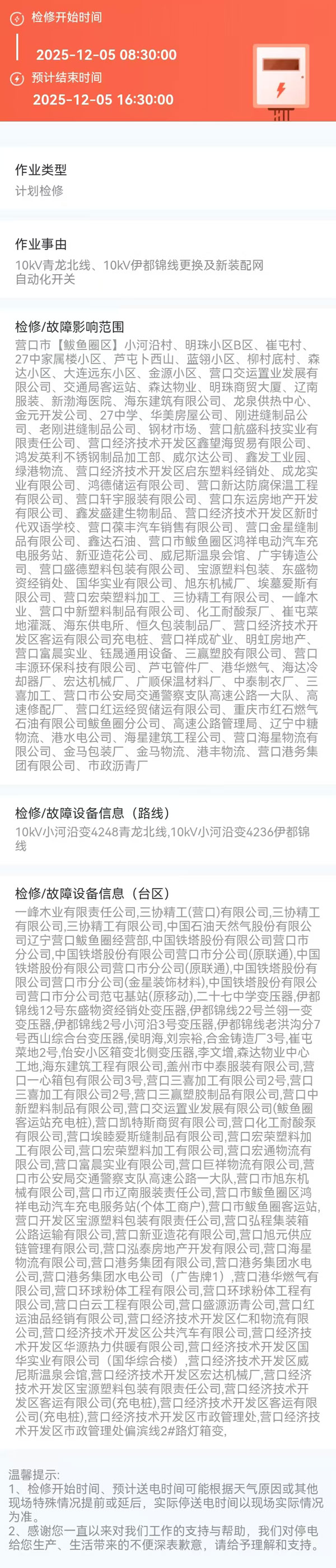 上一篇:2025年12月03日 鲅鱼圈区电网检修公告 下一篇:2025年12月15日 鲅鱼圈区电网检修公告