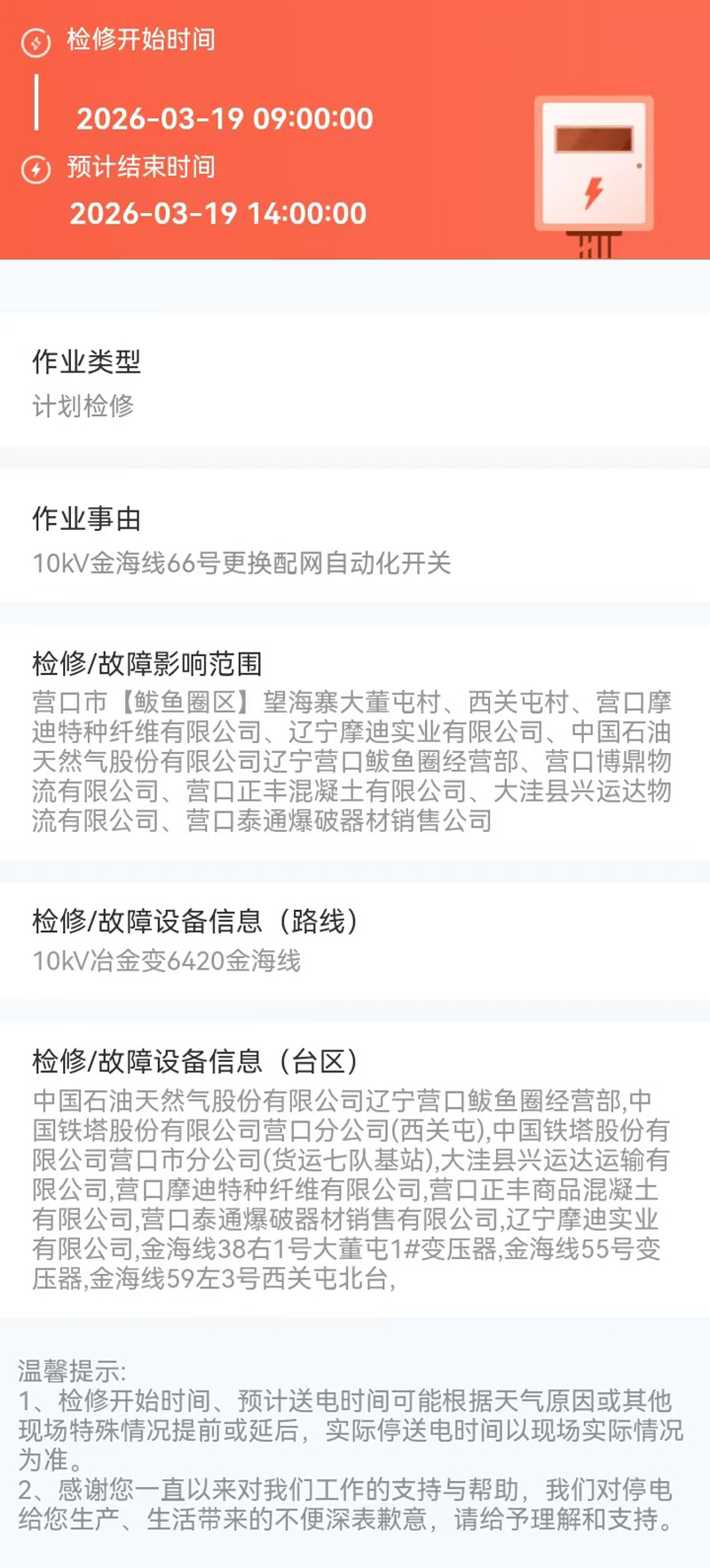 2026年03月19日 鲅鱼圈区电网检修公告 |