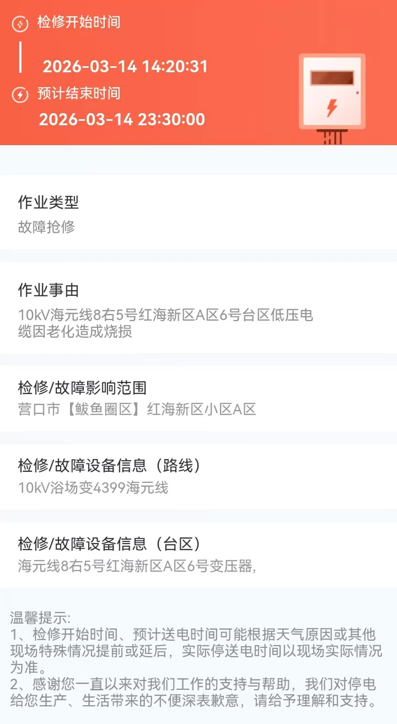2026年03月14日 鲅鱼圈区电网检修公告 |