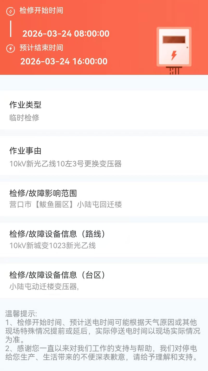 2026年03月24日 鲅鱼圈区电网检修公告 |