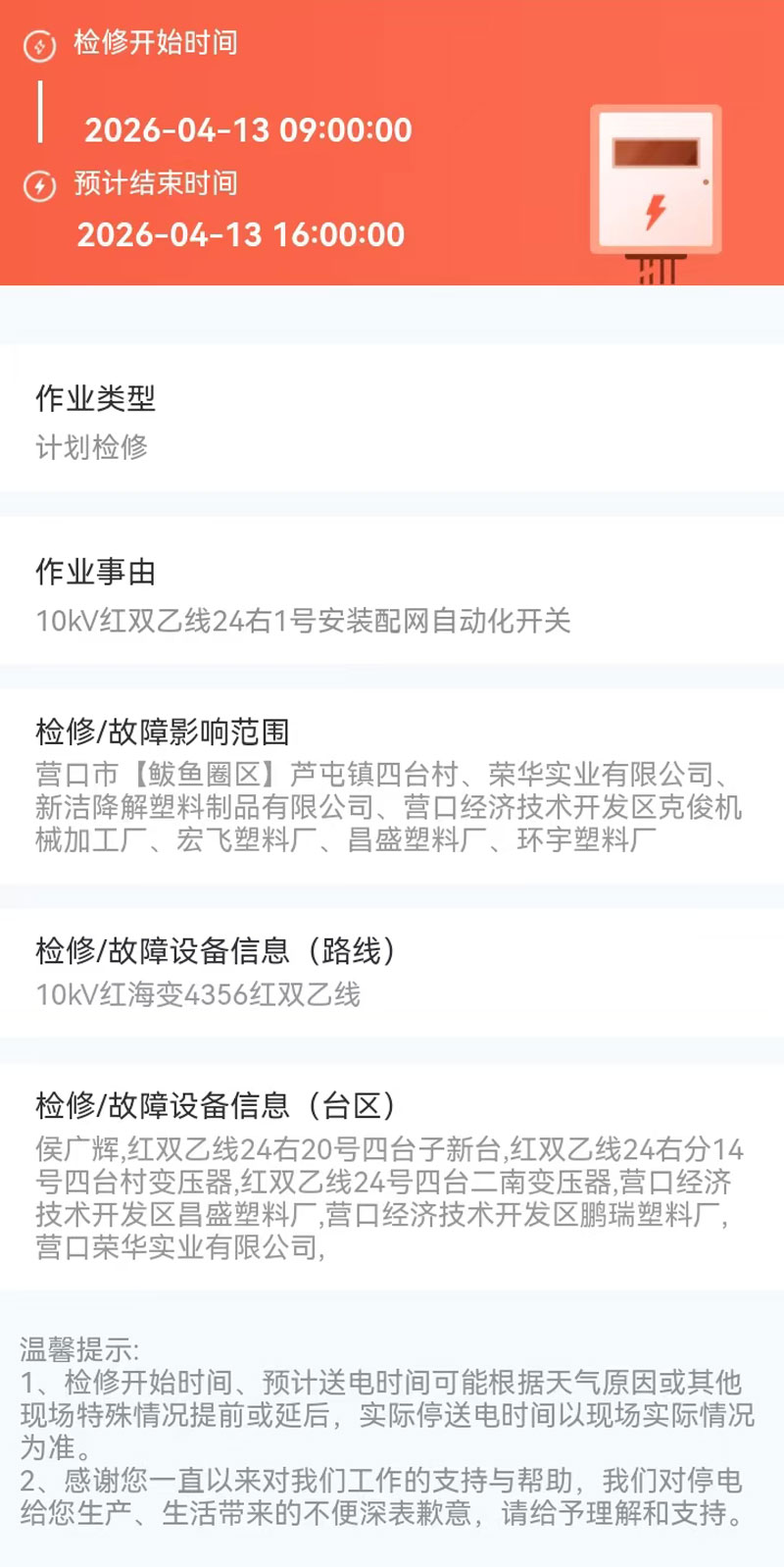 2026年04月13日 鲅鱼圈区电网检修公告 |