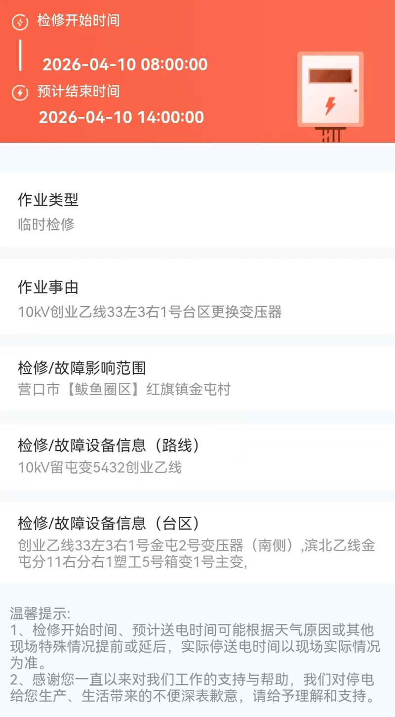 2026年04月10日 鲅鱼圈区电网检修公告 |