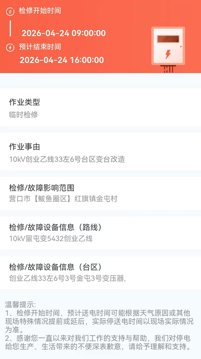 2026年04月24日 鲅鱼圈区电网检修公告 |