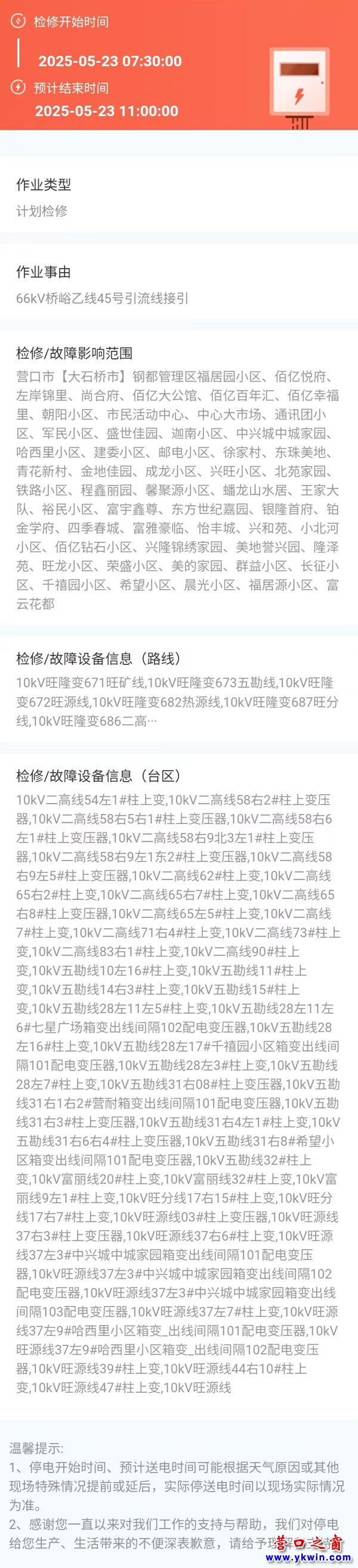 上一篇:2025年05月16日 大石桥市电网检修公告 下一篇:2025年05月23日 大石桥市电网检修公告