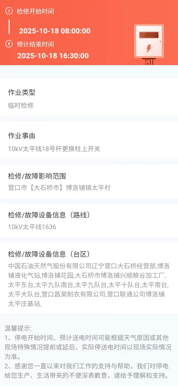 上一篇:2025年10月20日 大石桥市电网检修公告 下一篇:2025年11月13日 大石桥市电网检修公告