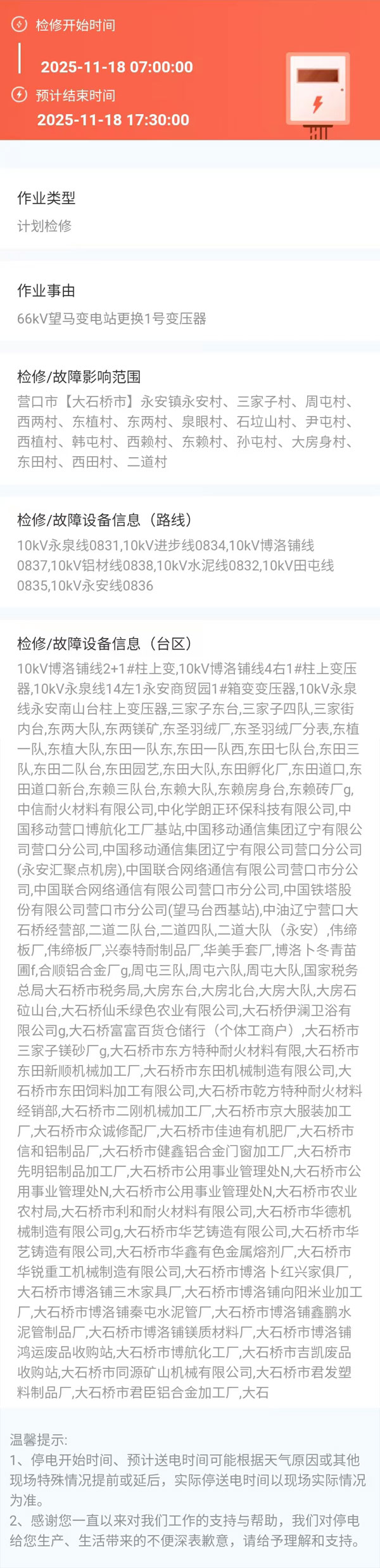 上一篇:2025年11月13日 大石桥市电网检修公告 下一篇:2025年11月21日 大石桥市电网检修公告