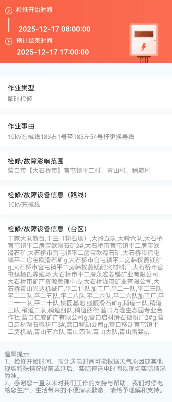 上一篇:2025年11月28日 大石桥市电网检修公告 下一篇:2025年12月23日 大石桥市电网检修公告