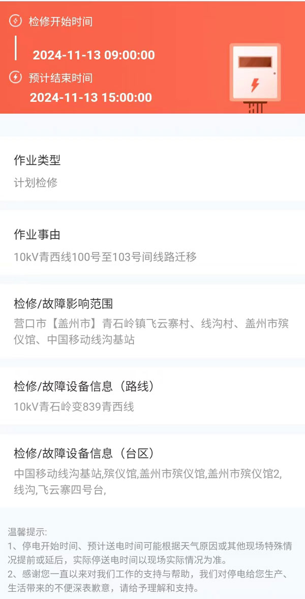 上一篇:2024年10月15日 盖州市电网检修公告 下一篇:2024年11月18日 盖州市电网检修公告