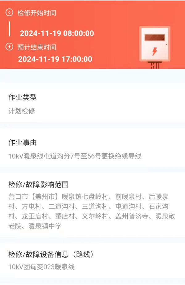 上一篇:2024年11月18日 盖州市电网检修公告 下一篇:2024年11月21日 盖州市电网检修公告