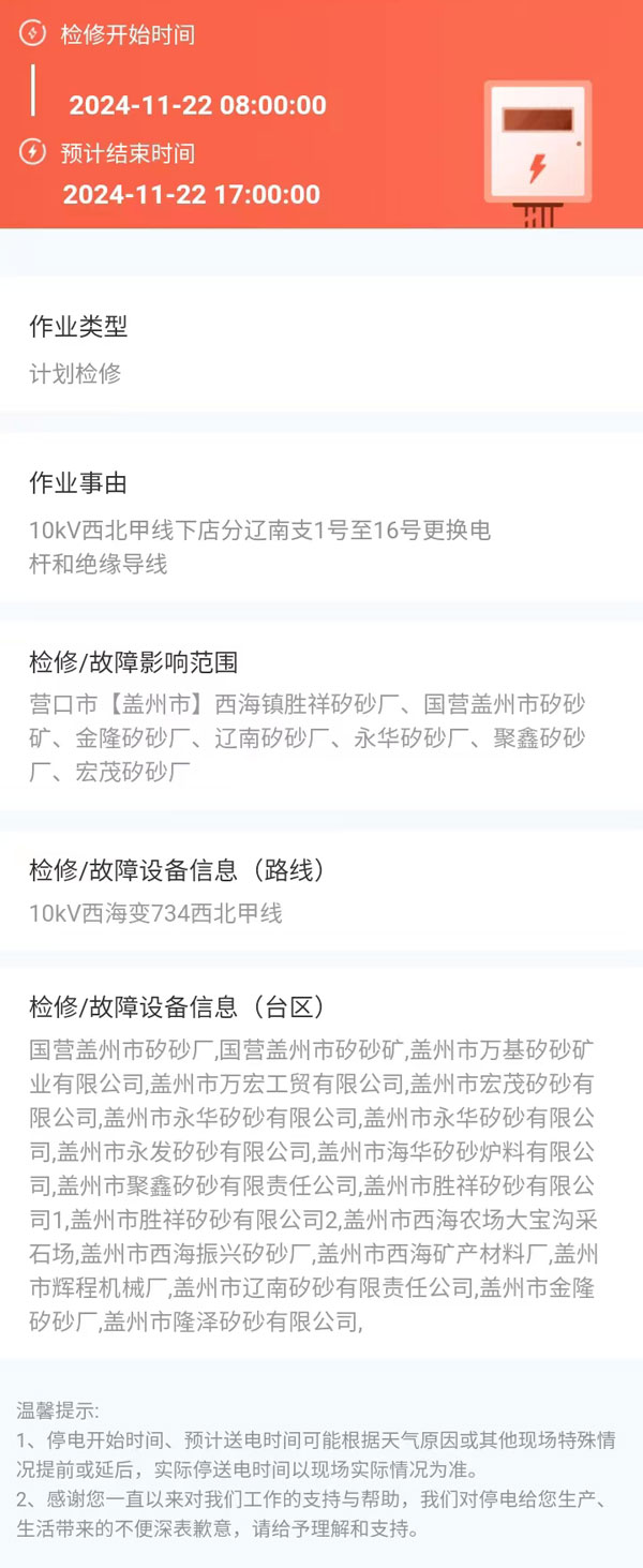 上一篇:2024年11月21日 盖州市电网检修公告 下一篇:2024年11月22日 盖州市电网检修公告