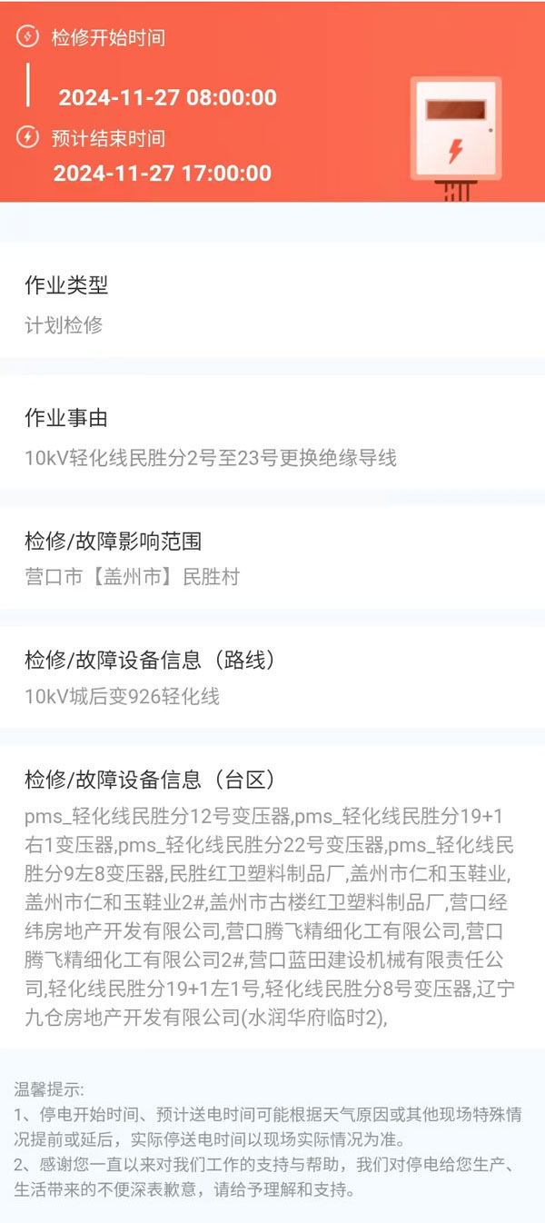 上一篇:2024年11月26日 盖州市电网检修公告 下一篇:2024年11月29日 盖州市电网检修公告