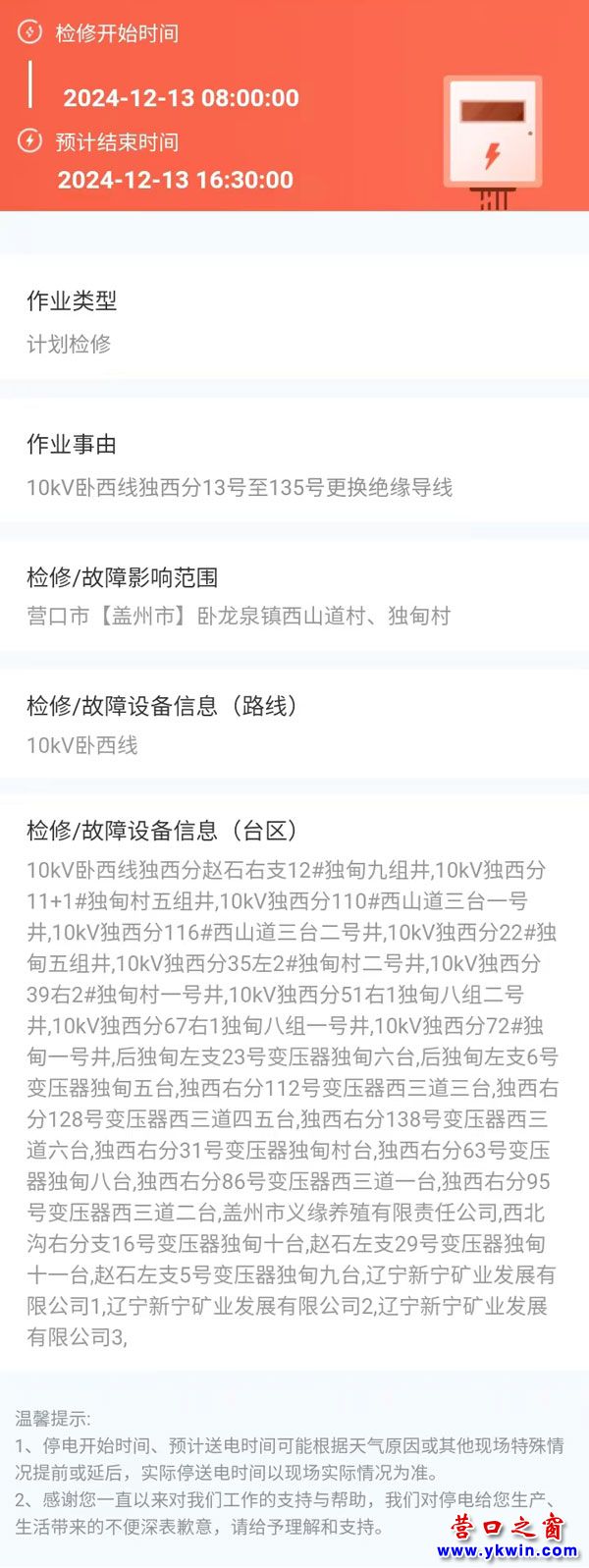 上一篇:2024年12月12日 盖州市电网检修公告 下一篇:2024年12月16日 盖州市电网检修公告