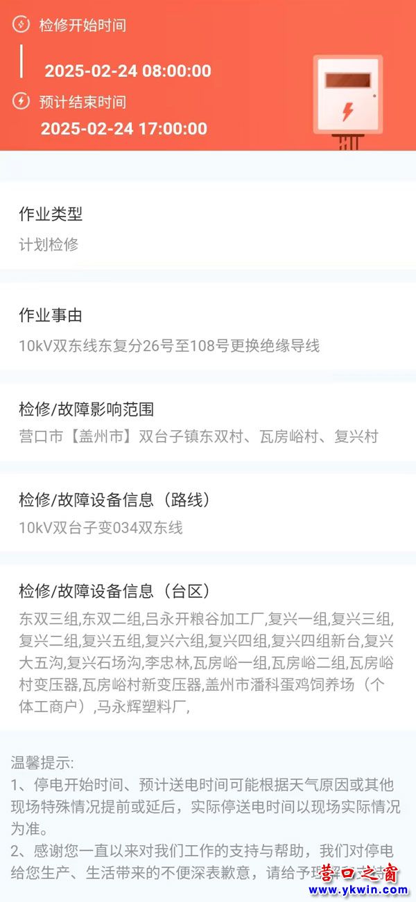 上一篇:2025年01月10日 盖州市电网检修公告 下一篇:2025年02月25日 盖州市电网检修公告