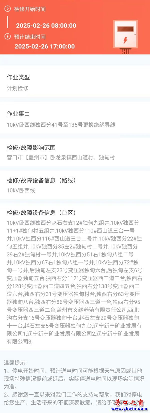 上一篇:2025年02月25日 盖州市电网检修公告 下一篇:2025年03月07日 盖州市电网检修公告