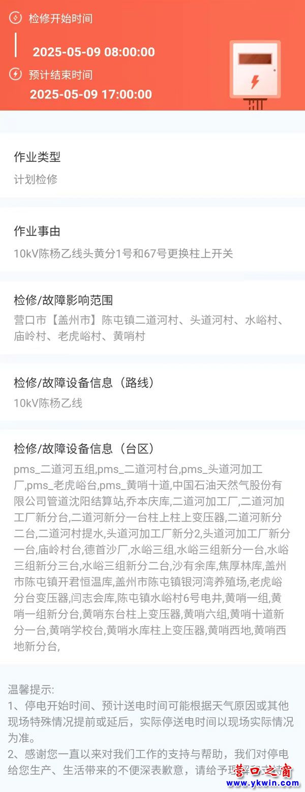 上一篇:2025年05月08日 盖州市电网检修公告 下一篇:2025年05月12日 盖州市电网检修公告