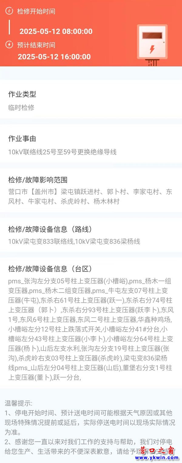 上一篇:2025年05月09日 盖州市电网检修公告 下一篇:2025年05月14日 盖州市电网检修公告