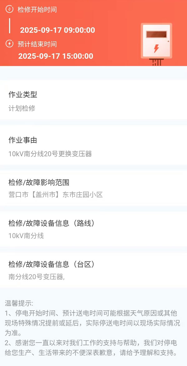 上一篇:2025年09月17日 盖州市电网检修公告 下一篇:2025年09月18日 盖州市电网检修公告