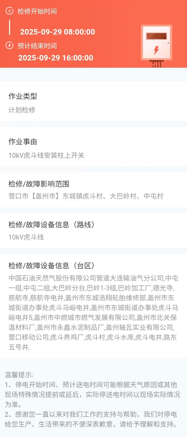上一篇:2025年09月26日 盖州市电网检修公告 下一篇:2025年09月30日 盖州市电网检修公告